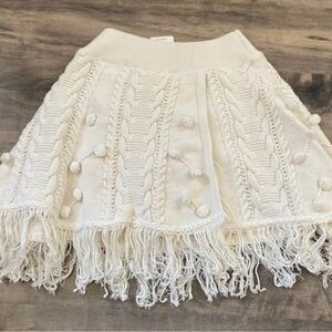Chic white mini skirt. Features fringe and textured details. Perfect for stylish outings.