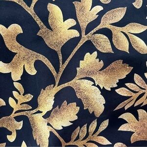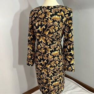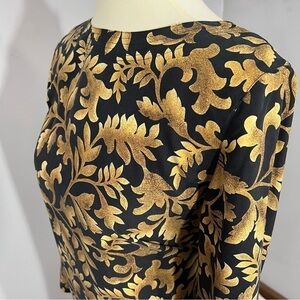 This is a beautiful black and gold fitted dress with a regal print. The lightweight silk has beautiful structure. There are buttons to accent the sleeves and on the left side of the bottom of the dress.