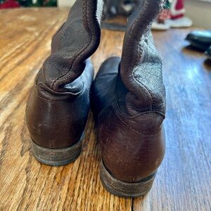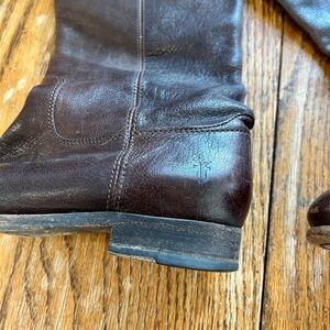 Awesome leather boots in dark brown by Frye. Crafted with quality materials. See images for best description. They have wear but are still in good condition. I can no longer wear them.