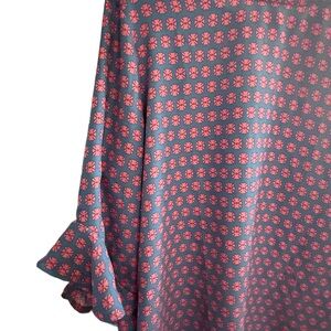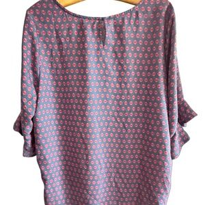 Medium blue and dark pink patterned blouse. Three quarter sleeves with flutter edge. Slight Hi-lo hem with side vent. Keyhole button closure in back. Beautiful colors that make for a striking pairing. Please see closeup of pattern for true color. Lighting makes it look lighter than it is. Medium blue with bright medium pink. It reads a little redder in pictures.