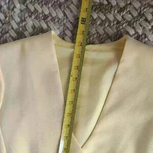 Stylish yellow blazer. Features black trim and buttons. Short sleeves and front false pockets.