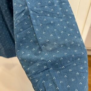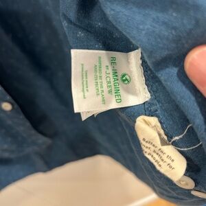 100% cotton. Soft and lightweight indigo dyed denim. Subtle distress/wear on sleeves. Since it is on both sleeves I am unsure if it’s from use or just part of the design. I have taken photos for reference.