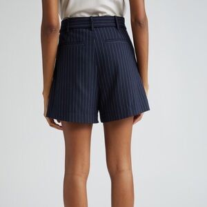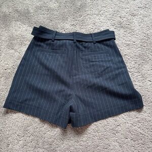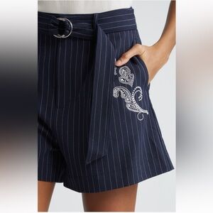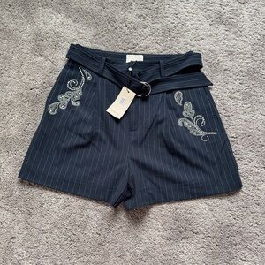 Chic navy shorts with pinstripe design. Features elegant embroidery and a stylish belt. New with tag. Smoke and pet free home.
