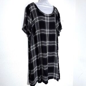 A women's plaid tunic dress from spenser jeremy woman. This versatile dress features a classic black and white plaid pattern, short sleeves, and a comfortable tunic silhouette with a back zipper closure. Its simple yet stylish design makes it perfect for everyday wear or a casual outing.