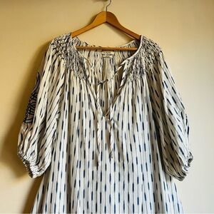 Beautiful "Hugh Jesmok" dress in an Ikat print with contrast embroideries. Part of the Regalia collection, a limited numbered collection that launched for subscribers first and sold out quickly. About 45 or less of these (in this color and across all sizes) were made.