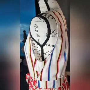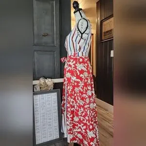 Vibrant red and white floral wrap dress with colorful stripes.