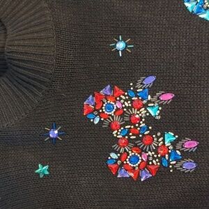 Stylish black sweater with colorful embroidered designs. Perfect for adding a touch of elegance to your wardrobe.