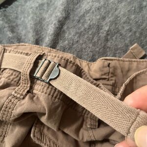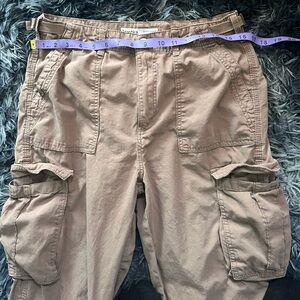 Casual tan cargo pants with a straight fit. Features a button closure and belt loops. featuring multiple large pockets, typically on the sides of the legs. It has a baggy or loose fit and adjustable straps for the waist . Please check photos for measurements