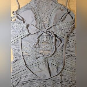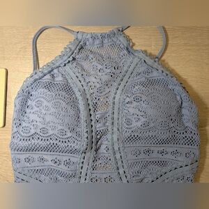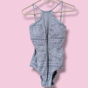 Becca Periwinkle Blue Crochet Open Knit High Neck Tie Open Back One Piece Swimsuit.