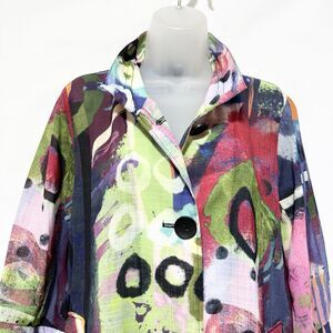 Unique and eye-catching lightweight jacket by Ali Miles featuring a bold multicolor abstract art print. Designed with a relaxed silhouette, button-front closure, and functional front patch pockets. A perfect statement layering piece for casual wear, travel, or artsy outfits.