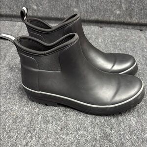 Chooka ankle boots in sleek black. Red logo detail adds a pop of color. Durable and stylish for rainy days.