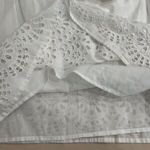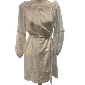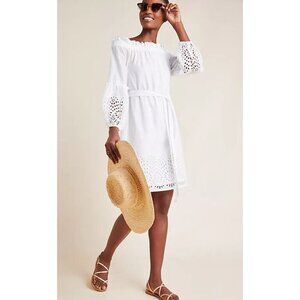 Anthropologie White Cotton Eyelet Lantern Sleeve Off-Shoulder Boho Dress Sz 12