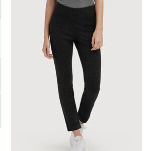 These are indeed super stretchy and comfortable, but with sleek details: cuffed hem, seams down the backs of the legs, faux back pockets