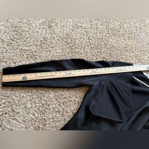 Diane von Furstenberg black satin draped V-neckline blouse. This blouse features a V-neckline, long sleeves, and a draped design that creates a twisted effect at the front.