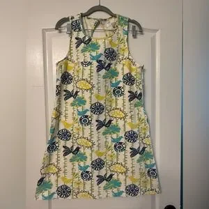 Beautiful Utility Canvas cotton dress featuring a whimsical bird and botanical print in green, blue, and yellow. Made in the USA from sturdy yet comfortable cotton canvas with a flattering A-line silhouette.