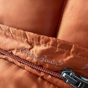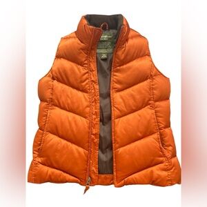In excellent condition goose down puffer vest with front zipper and zip side pockets. Very warm, burnt orange color with satin finish. Zipper pull is a bit snagged (as pictured) but does not detract from the vest.