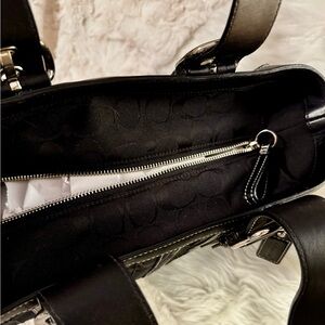 This sophisticated Coach canvas tote bag features a sleek black leather design with distinctive white contrast stitching, offering a timeless and elegant look. The structured yet relaxed shape makes it a versatile accessory for any occasion, while the high-quality craftsmanship ensures durability and style. Measures 12x11x6.