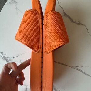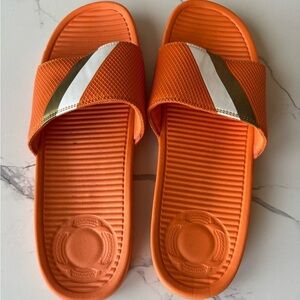 Vibrant orange slide sandals featuring stylish gold and white stripes. Perfect for casual wear.
