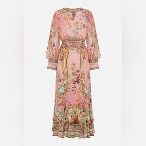 The Letters From The Pink Room Long Button Front Dress depicts an atmosphere of soft pink with turquoise highlights amongst a world of pretty blooms and golden filigree. Adorning CAMILLA crystals, this luxury silk occasion dress features soft blouson sleeves, a deep v neckline, a shaped waist with button front enclosure and an elegant maxi hemline that falls into exquisite tiered frills. A show stopping formal dress designed to steal the spotlight. Lovingly handcrafted, designed in Australia. Explore more from the Amore Mio collection.