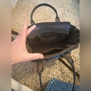 Stylish Coach leather tote with studded leather design. Features dual handles and signature tag. Brushed Nickel hardware. Worn a few times- some wear on the bottom of the bag hardware as to be expected as that is how the bag stands up when put down. Otherwise excellent.
