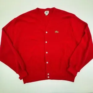 Keywords: Izod, Lacoste, red cardigan, mens sweater, acrylic knit, V-neck, button up, classic, preppy, sportswear, casual wear, outerwear, vintage style, grandpa core