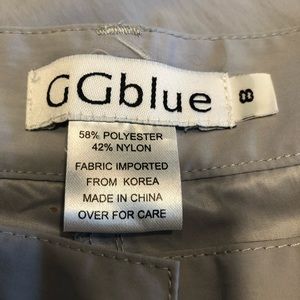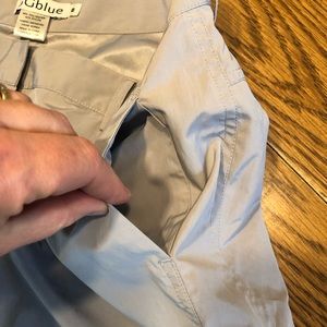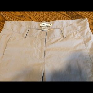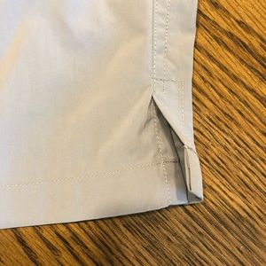 Light gray color golf capris. Polyester and nylon. Very light, thin, cool feel. Two front pockets and two back pockets. Belt loops. Excellent condition. Zipper and clasp closure. Slits at bottom of legs.