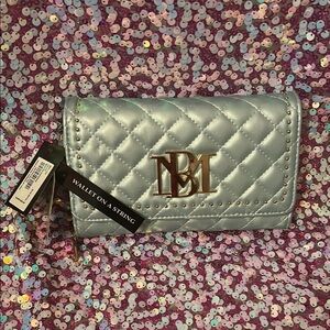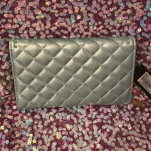 Elegant silver quilted wallet with gold accents. Features a stylish logo and studded details. This bag is so cute it’s a light blue bag has a nice shiny look to the material . It’s pretty cool it has a wallet inside the bag . Brand new with tags. The zipper on this bag sometimes has trouble zipping I think it has to do with one of the teeth .