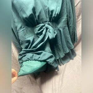 Beautiful dress that could be worn for many different formal or fancy dinner occasions. It’s a dark emerald green with velvet chiffon fabric. Retail is $200. The size tag is missing but it would fit a medium - large. It is a romper so the bottoms are shorts.