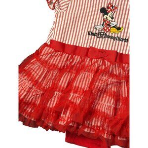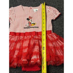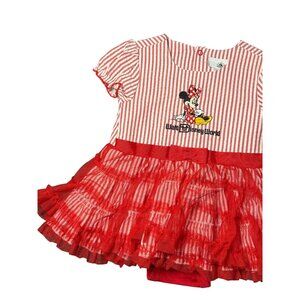 Adorable Walt Disney World Minnie Mouse baby girl dress in size 12-18 months. Features red and white stripes with a ruffled tutu skirt. Perfect for Disney trips, special occasions, or everyday wear.
