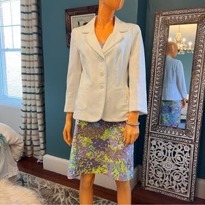 EUC spring floral cotton blend linen texture skirt from TALBOTS in shades of lilac / orchid / lavender / purple and line green and turquoise blue and beige / tan and white. Fully lined. Center back slit. Center back hidden zip with hook and eye closure. Longer than a true mini but not quite midi.