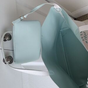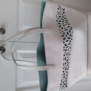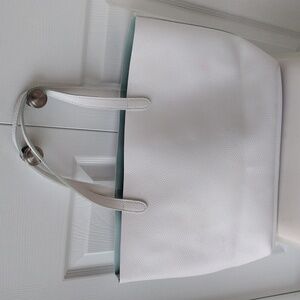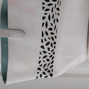 This stylish white tote bag features a striking cut-out pattern. Perfect for any occasion, it combines elegance with functionality. Includes an inside attachable zippered light blue pouch. Inside is a light blue.