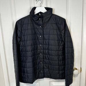 Elegant black quilted jacket. Features snap buttons. Ideal for cool weather. 100% Authentic - 100% Positive Feedback -