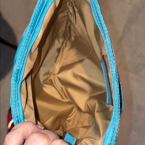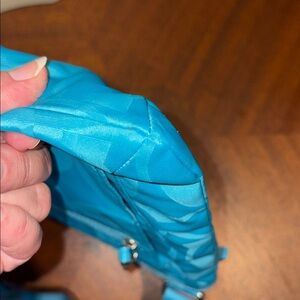 Front has oval enameled aqua coach logo on top of a large front zipper pocket/aqua blue patent pull