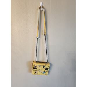 Boxy crossbody bag covered in polished studs and vibrant bird embroidery. Flap closure. Pull-through chain strap. Polyester. In great preowned condition. Smoke free home.