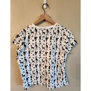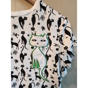 Lite Wear women's T-shirt size XL. Mid century style black cats with pumpkins, stars, spiders, spider webs, and skull and crossbones. Cap sleeve. In good preowned condition. Smoke free home.