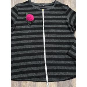 A stylish ZARA women's sweater featuring black and gray stripes with pink floral embellishment. The sweater offers a casual yet chic look, perfect for cooler seasons.