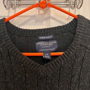 Keywords: American Eagle, mens sweater, cable knit, vintage, slim fit, V-neck, long sleeve, black sweater, textured knit, fall fashion, winter wear, casual style, layered look