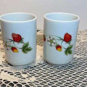 * 2 - OMC Strawberries Japanese juice glasses. White ceramic. From the 1970's. Sticker residue from label on bottom.