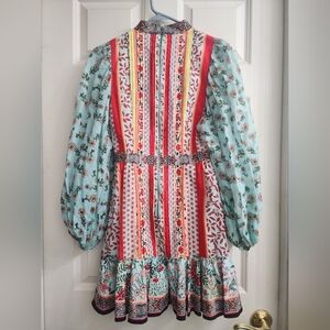 colorful floral dress featuring balloon sleeves and a ruffled miniskirt.