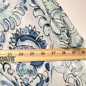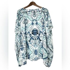 This relaxed tunic from Chico's showcases a beautiful blue and white pattern, offering a boxy silhouette with long sleeves. The intricate design adds a touch of elegance, making it a versatile addition to any wardrobe.