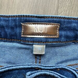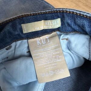 These are KUT from the Kloth Kelsey Fab Ab Ankle Flare jeans. They are a high-rise, ankle-length style with a flared leg and raw hems.