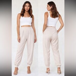 Nasty Gal Collection beige pants featuring a modern tailored jogger silhouette. Designed with a high-waisted fit, elegant front pleats, and an elasticized hem for a relaxed yet polished look. Finished with a button closure and decorative back pockets.