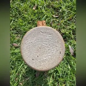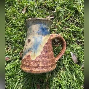 Great shape with a slightly flared rim and a comfortable pulled handle. This has a clear 1970s studio pottery / artisan feel, likely made by an individual potter rather than mass-produced. Signed on the bottom (illegible but hand-marked).