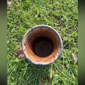 Vintage hand-thrown studio pottery mug with a beautiful earthy glaze — deep denim blue blending into soft green over a raw, speckled clay body. The glaze has natural movement and drip, and the texture is really nice in hand.