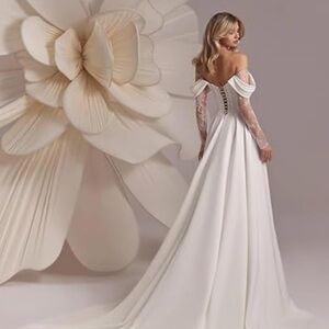This chic off-shoulder wedding dress in a beautiful cream shade is perfect for your special day. Its elegant design and exquisite details make it a standout choice.
