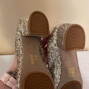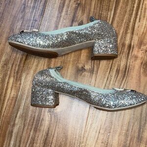 Champagne glitter Block heel with elastic band and dainty bow to finish them off! What more could you ask?!