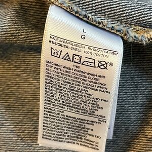 Classic longer blue jean jacket with button-up front. Features chest pockets and a relaxed fit. Waist cinches with inside toggle