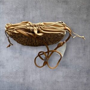 Design: It features a light brown color and a structured shape, can be used as a shoulder or crossbody, and has a tie drawstring closure at the top.