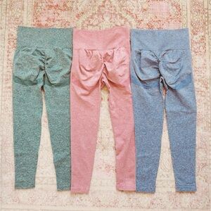 Enjoy comfort and style with this set of three high-waisted leggings. Includes green, blue, and pink colors. In perfect condition unless otherwise stated. No flaws rips or tears. I am open to all offers, message me for size measurements and more! Originally bought from Amazon, never worn.