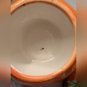 Charming orange ceramic container shaped like a orange fruit. Features a green leaf on top. Does have crack lines. I don't see any chips. Is marks inside.